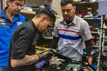 Una vez al mes invitamos a 4 propietarios de motos Yamaha a nuestro taller donde recibirán: revisión mecánica, cambio de aceite, cambio de pastillas de freno y charla técnica con Samuel.